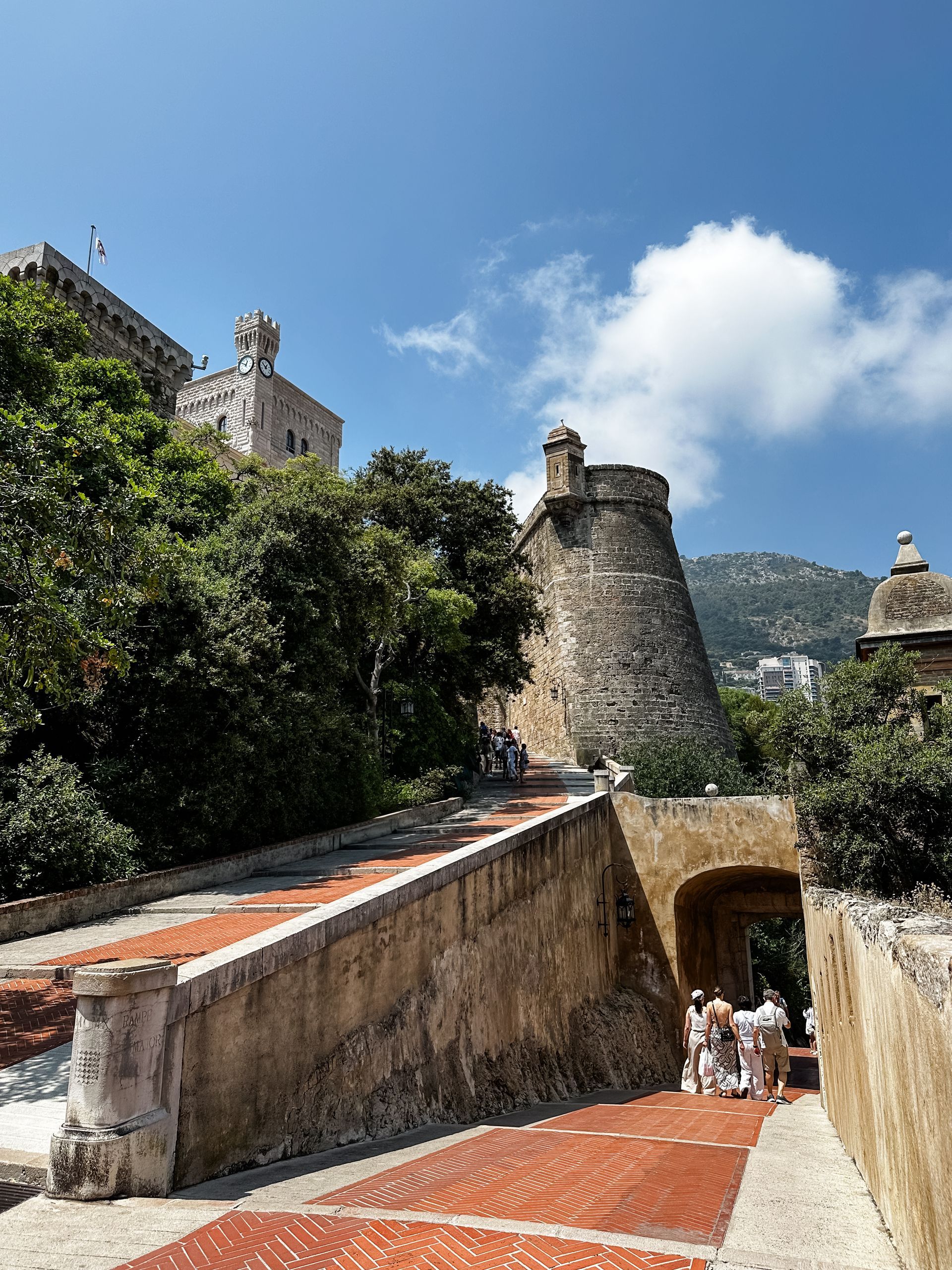 The hike is a mix of stairs and inclines. The beginning of the hike is in the woods, which turns into the fortress walls near the top. The first thing you will see when you get to the top of the Rock is the Prince's Palace.